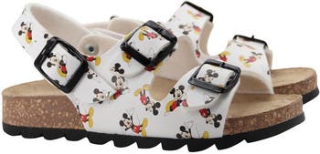 The All Over Mickey Print Sandals featuring an all-over print, an open toe, an ankle strap with a side buckle fastening, a branded insole and a flat rubber sole.