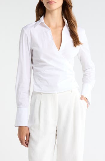 This crisp cotton-blend shirt is rendered in a faux-wrap silhouette that's secured at the side by miniature buttons.