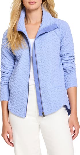 Puffed geometric quilting warms a midweight cotton-blend jacket framed by sporty raglan sleeves and a curved high-low hem.