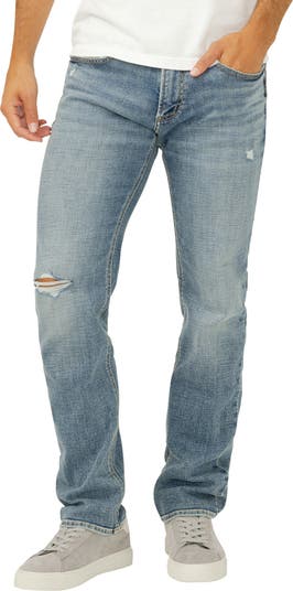 A classic fit that's always in style, these straight-leg jeans are made from soft stretch denim with distressed details for a lived-in look.