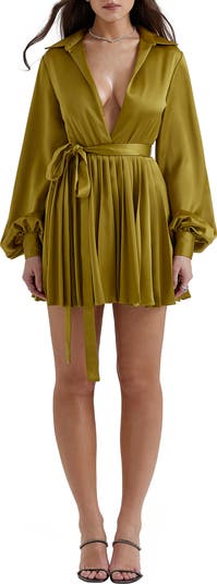 This plunging faux-wrap cocktail dress is cut in a mini length and designed with a fluttery pleated skirt for extra drama.