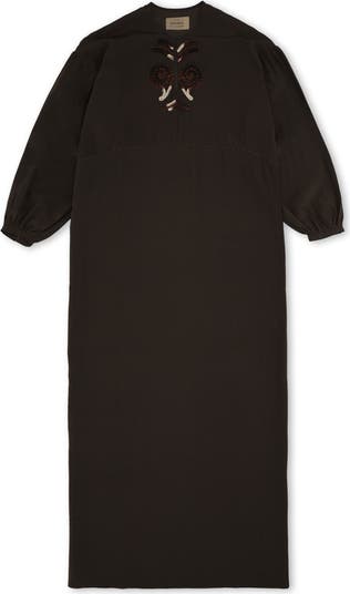 The WALLEGRAL long dress It is a Bohemian inspired caftan , with a design that evokes a nostalgic and modern atmosphere at the same time. Made of 100% Silk Crepe. The precious embroidery in wooden beads and degradé grosgrain ribbon recall folk motifs, maintaining a sophisticated and timeless elegance. The fit is soft but at the same time elegant thanks to deep side slits. Versatile and practical, it can be worn both as a beach item for those looking for an elegant and relaxed style, and in everyday life, for an original look full of personality. On the back, the iconic Fortela stitching with orange thread embodies the philosophy of the brand, which creates each garment to last over time, evolving together with the wearer and carrying with it a piece of history, revisited thanks to the inspiration and vision of Alessandro Squarzi.
