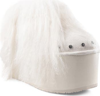 Soft shearling trim dials up the retro attitude of this lofty platform bootie embellished with polished rivet hardware.