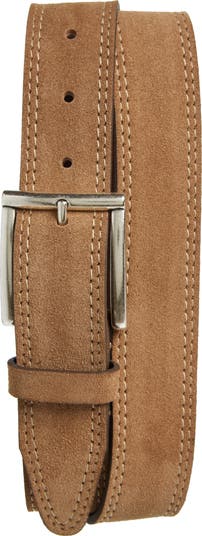 A brushed buckle and tasteful topstitching elevate a handsome dress belt handcrafted in the USA from richly textured suede.