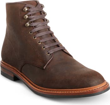 A plain-toe boot is hand crafted in the USA and welted to a durable rubber tread.