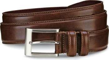 Premium Italian leather done in a burnished, fine-grain finish smartens the look of a belt styled with a high-polish pin buckle.