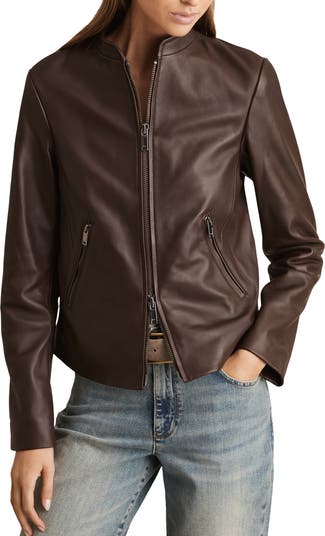 Supple leather brings rich texture to this cool-weather-essential jacket topped with a posh stand collar and popped with edgy zip pockets.