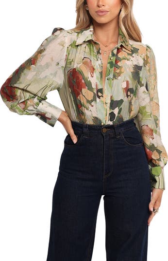 Soft gathers enhance the blousy fit of this light and lovely button-up shirt covered in an enchanting floral print.