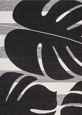 The bold pattern of this classic rug is inspired by Hollywood Regency style, It's made from durable synthetic fibers woven into tropical leaves on a striped ground. Use this stylish rug outdoors, or in the bedroom, living room or dining room.