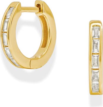 Channel-set baguette-cut cubic zirconia brings light-catching sparkle to these reimagined hoop earrings plated in 14-karat yellow gold.