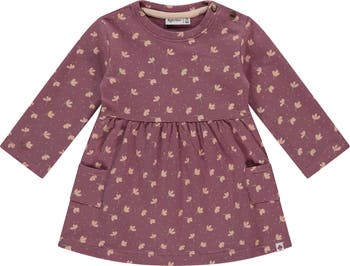 This purple-toned long sleeve dress features an allover beige-toned floral print and a tiered accent below the bodice.