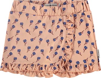 This salmon-toned skort features a fold-over ruffle trim that continues along the hems of the shorts and is complimented by an allover royal blue floral graphic.