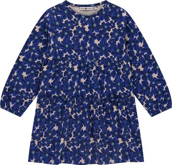 This long sleeve dress features tiered enhancements and an allover cobalt-toned floral print.