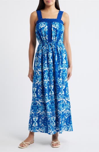 A vibrant, artistic pattern serves as a stunning focal point for this sleeveless maxi dress complete with lacy trim.