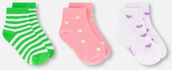 These 3 pairs of socks are a must-have for little girls’ daily outfits. The set includes three playful motifs: one pair with allover polka dots, one pair with cheerful stripes, and one pair with cute background. Made from a soft cotton blend with elastane and nylon, they are stretchy, breathable, and comfortable for all-day wear.