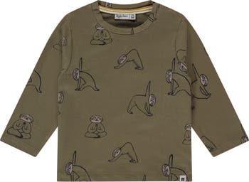 This olive-toned long sleeve t-shirt features a monochromatic allover olive-toned yoga themed koala graphic.