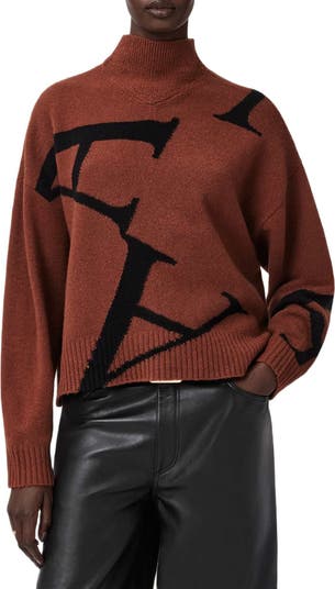 Envelope yourself in the warmth of this woolly turtleneck sweater knit in an oversized silhouette with drapey dolman sleeves and bold lettering.