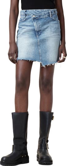 A faded finish and an asymmetric hem with slight fraying accentuate the casual-cool attitude of this nonstretch-denim miniskirt.