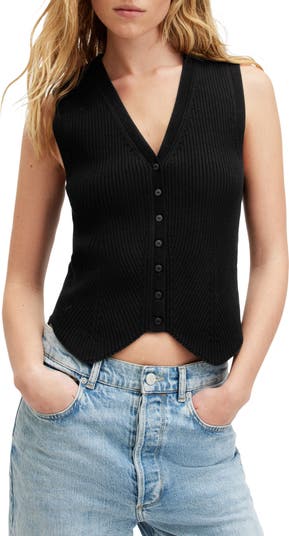 Love to layer in this close-fitting sweater-vest knit in a cropped silhouette with allover ribbing.