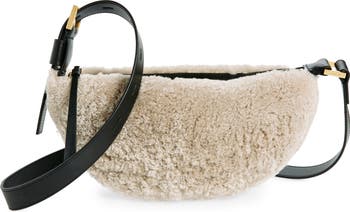 Plush genuine shearling brings an element of cozy to this crescent-shaped crossbody suspended by an adjustable leather strap.