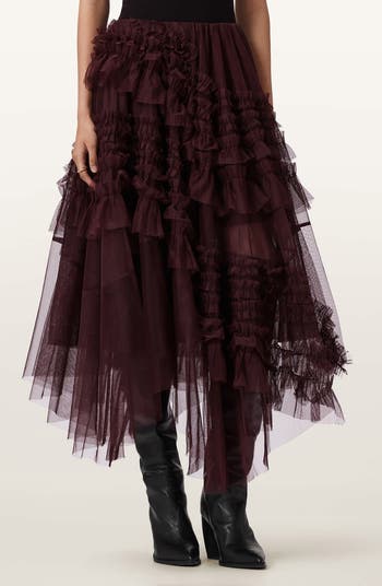 Frothy ruffles cascade in a tiered, spiralic design around this dreamy asymmetric-hem skirt that's a chic way to introduce ballerina-worthy texture into any ensemble.