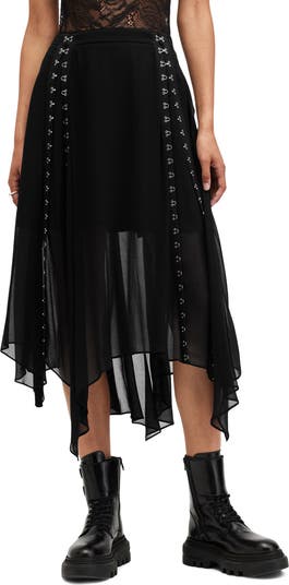 Sleek hardware punctuates the grosgrain trim of this swishy handkerchief-hem skirt that showcases windows of sheer fabric for added allure.
