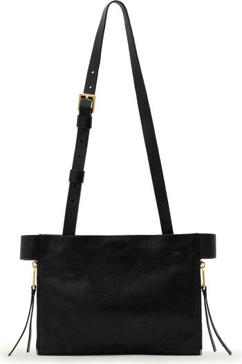 Zippered side gussets with tasseled pulls expand the silhouette of this low-profile crossbody made from richly grained leather.
