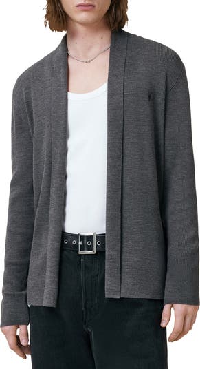 Fine merino wool yarns bring season-spanning versatility to this casual-to-polished cardigan with a shawl collar framing the open front.
