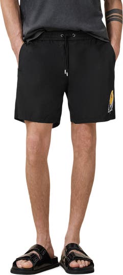 Ride the party wave in these lightweight swim trunks, adorned with a playful smiley graphic on the leg.
