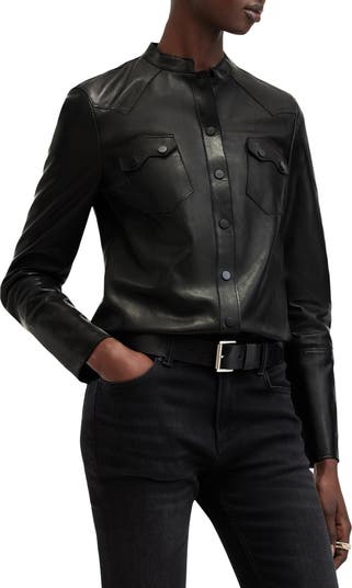 Western-inspired seams detail the yoke of this edgy snap-front shirt made from glossy black leather that's buttery soft to the touch.