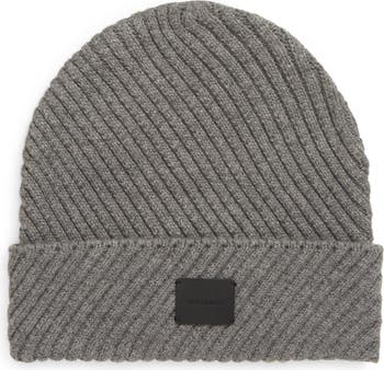 Top off your look with this cuffed wool-kissed beanie featuring a logo patch and diagnonal ribbing.