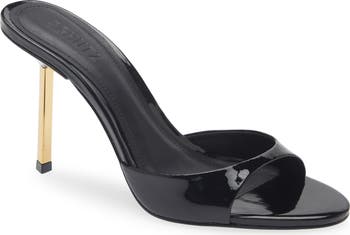 A slender toe and geometric pin heel bring striking balance to a minimalist slide sandal made in Brazil and shaped from glossy leather.