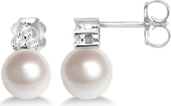 14K white gold stud earrings featuring 7–7.5mm freshwater cultured pearls accented with diamonds, offering classic elegance and timeless sophistication.