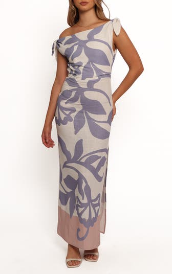 Summery sophistication defines this lightweight woven dress featuring a retro floral pattern and asymmetric neckline.