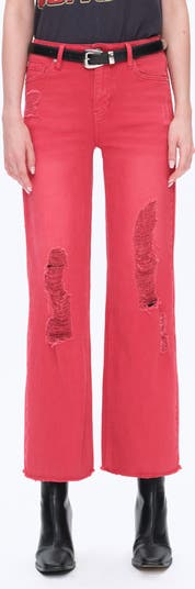 Distressed detailing at the knees and hems add lived-in appeal to these high-waist jeans cut from stretch denim and finished in a fiery red wash.