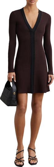 Allover ribbing enhances the close fit of this leggy-length dress made with a low-dipping neckline and contrasting trim.
