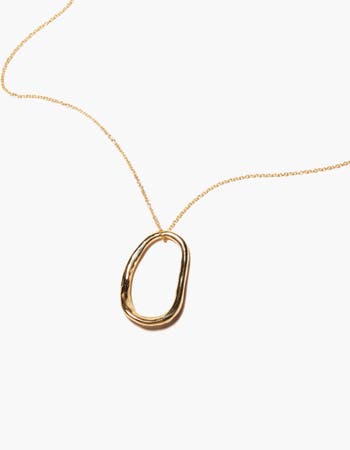 An elegant, organically-shaped oval pendant in glossy brass that dangles from a delicate gold-fill chain. Alma was hand-sculpted in wax, cast in recycled brass.