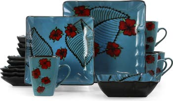 Add a beautiful accent to your dinner table with the Elama Aloha Tide 16 Piece Square Stoneware Dinnerware Set in Blue and Floral. Each dish is creatively crafted into unique and contemporary shapes and beautifully colored in stunning blue with red and black tropical accents. Each plate in this set is microwave safe for quick reheating and dishwasher safe for easy cleaning.