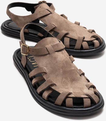 A minimalist gladiator sandal that reinterprets classic form with soft suede texture and a closed front panel