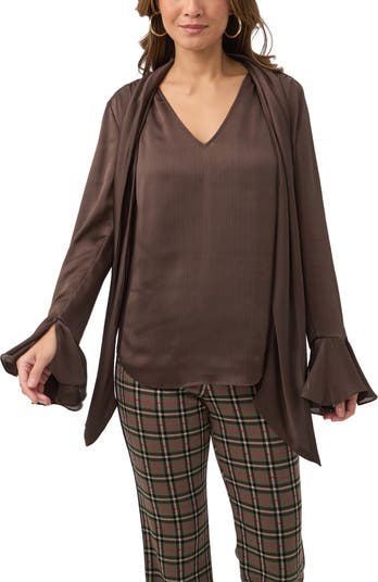 Long sleeve blouse in crinkle georgette with flared cuffs and an attached neck tie