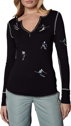 Relive the glory of your '90s ski free fantasy in this fitted henley that's embroidered with plankers skiing down an endless slope that's rumored to be inhabited by the Abominable Snowman.