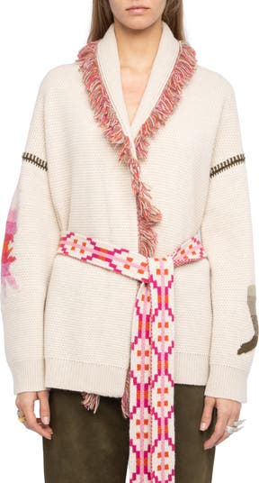 Cozy with an artful edge, this open-front wrap cardigan is knit from a soft wool-and-cashmere blend for warmth without weight. A fringed shawl collar and mixed stitch patterns add rich texture, while a branded sunset motif across the back makes a striking statement. The removable belt cinches the silhouette or can be worn loose for an effortless, layered look.