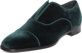Minimalist, laceless styling defines a contemporary cap-toe shoe made of soft green velvet with a signature crimson sole.