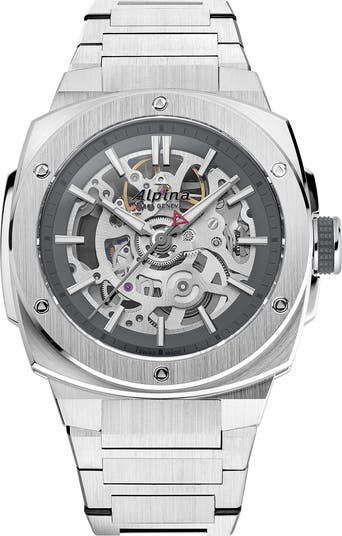 With a water resistance of 200 meters and impressive 38-hour power reserve, this brushed-bracelet watch was built for exploration. Luminous markers and hands help maintain readability in dark or deep conditions, while a skeleton dial offers an eye-catching utilitarian aesthetic.