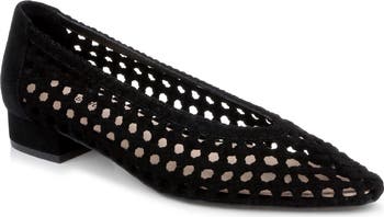A high-cut topline and intricately woven leather upper add dimension to a snip-toe pump set on a cushioned footbed and low block heel for walkable comfort.