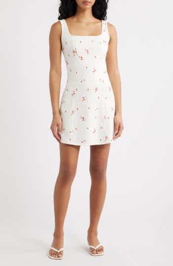 A scattering of dainty blooms and a romantically squared neckline deeply sweeten the style story for a stretch-cotton mini that's easy to style up or down.