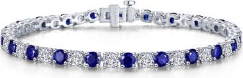 Clear simulated diamonds are offset with dainty lab-created sapphires or rubies adding an elegant splash of color to this timeless tennis bracelet.