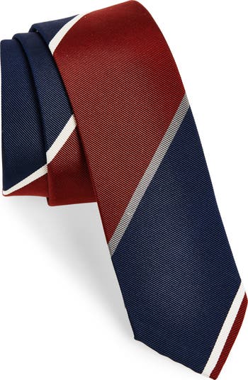 In classic Thom Browne fashion, bold stripes star on this silk-rich mogador tie backed by signature tricolor grosgrain and a school-inspired name tag that hints at preppy provenance.
