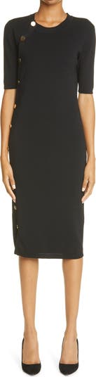 A row of high-shine buttons faithfully follows curves as it slinks down the side of this ribbed body-con sheath.