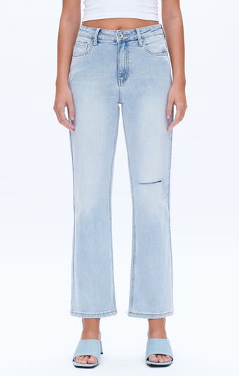A ripped knee lends breezy vibes to these high-waist jeans made from low-stretch denim and finished in a light-blue wash.